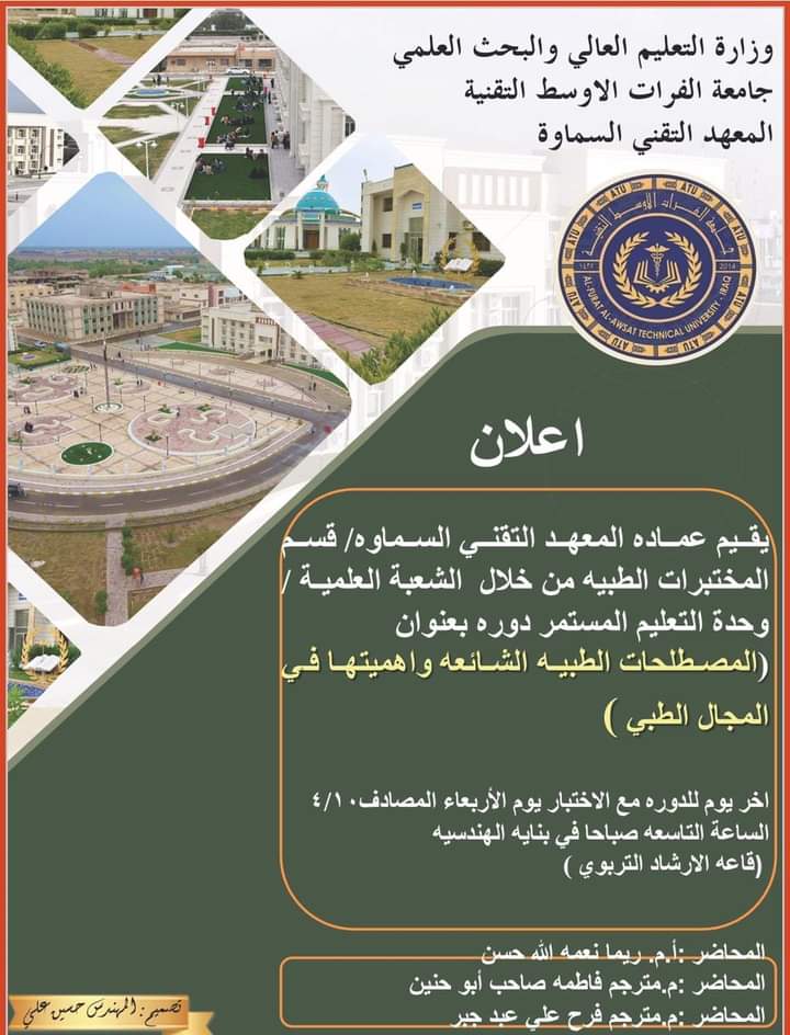 جامعة الفرات الأوسط التقنية تقيم دورة بعنوان (المص... أقام قسم المختبرات الطبية بالتعاون مع الشعبة العلمية /وحدة التعليم المستمر في المعهد التقني السماوة بجامعة الفرات الأوسط التقنية، دورة علمية بعنوان(المصطلح...