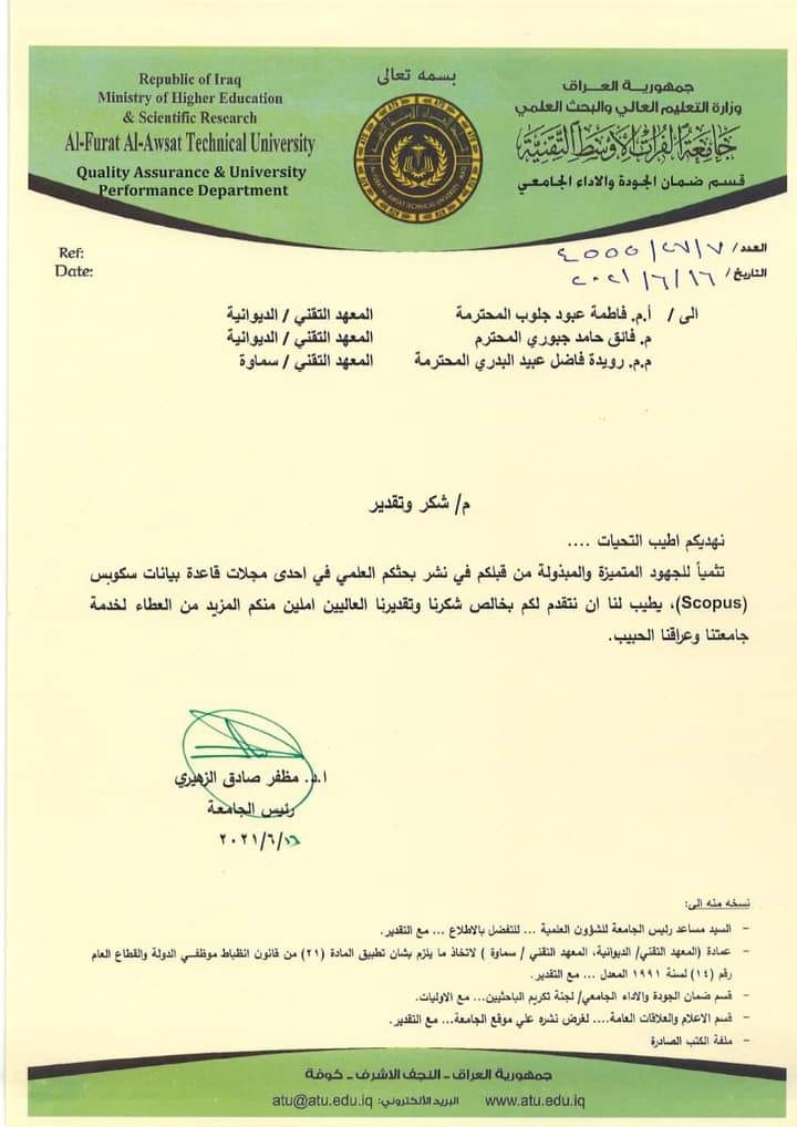 حصلت السيدة رويدة فاضل عبي التدريسية في المعهد التقني السماوة علي كتاب شكر وتقدير من الأستاذ الدكتور مظفر صادِق الزهيري رئيس جامعة الفرات الأوسط التقنية وذلك لنشرها بحث علمي في احدى المجلات العالمية ضمن قاعدة بيانات سكوبس.